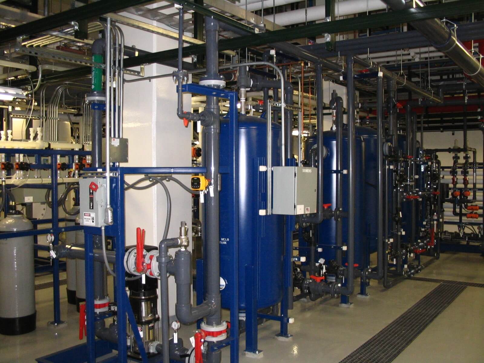 The plumbing consists of a sanitary waste system to serve the restrooms and break areas. The laboratories have an acid waste system of fuseal acid resistant pipe made of flame retardant polypropylene and three acid dilution tanks with two re-circulating pumps and two transfer pumps being controlled from a LED panel. The laboratories have a central domestic hot water compressed air, nitrogen, natural gas and D.I. water systems.